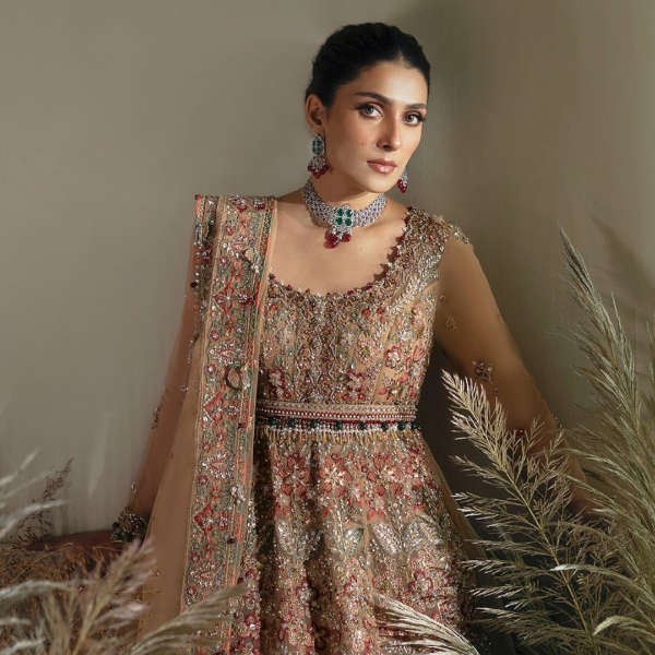 Afrozeh introduces The Brides Edit collection, exquisite wedding dresses for Pakistani women featuring hand-embellished organza fabric with intricate embroidery, including front and back bodies, panels, sleeves, and dupatta. The set is completed with a raw silk dyed trouser for a sophisticated look, making it a luxurious and elegant choice for brides.